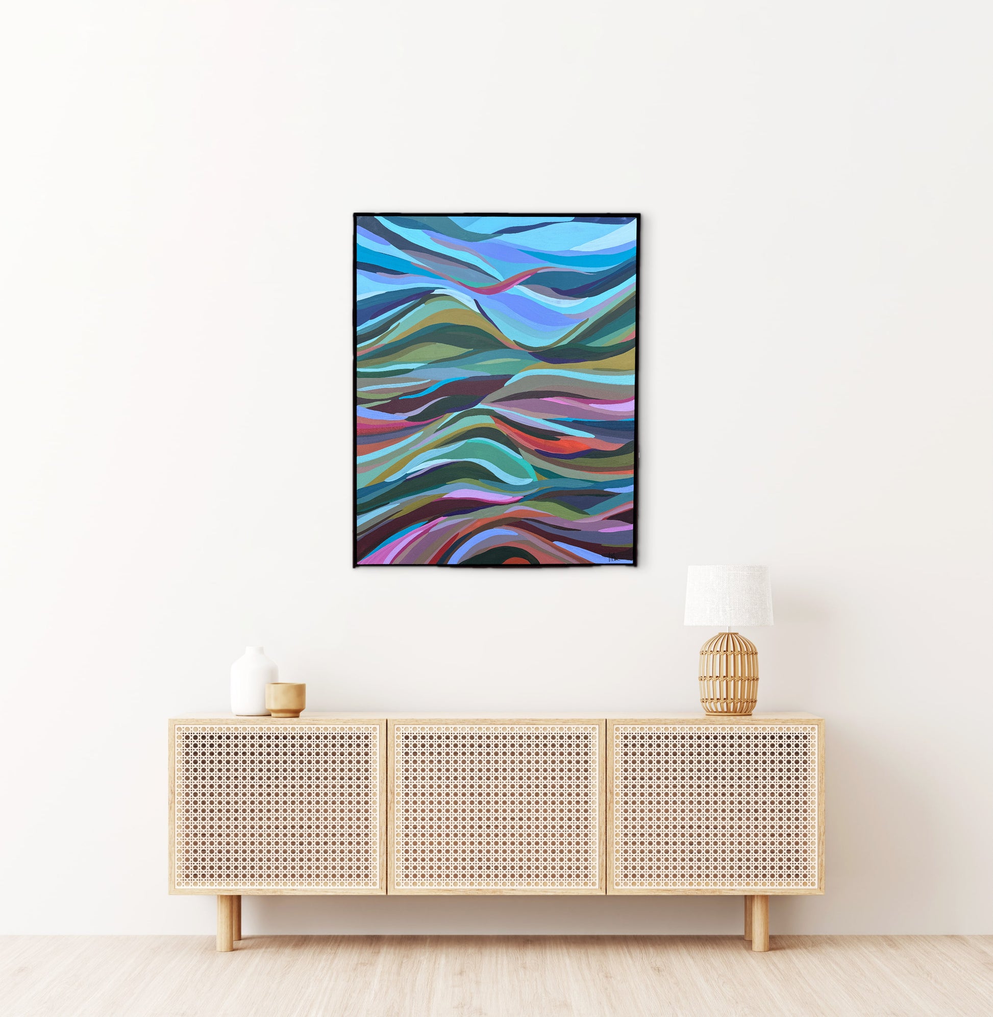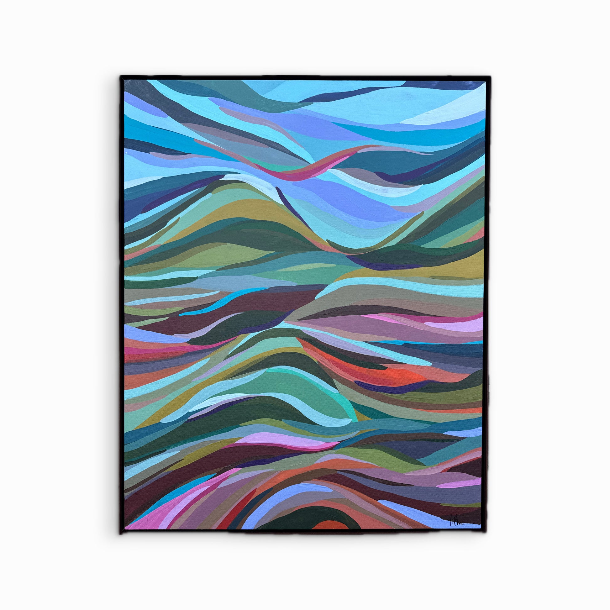 This is an original acrylic abstract landscape painting on canvas, measuring24x30 inches with a dark metal low profile frame.