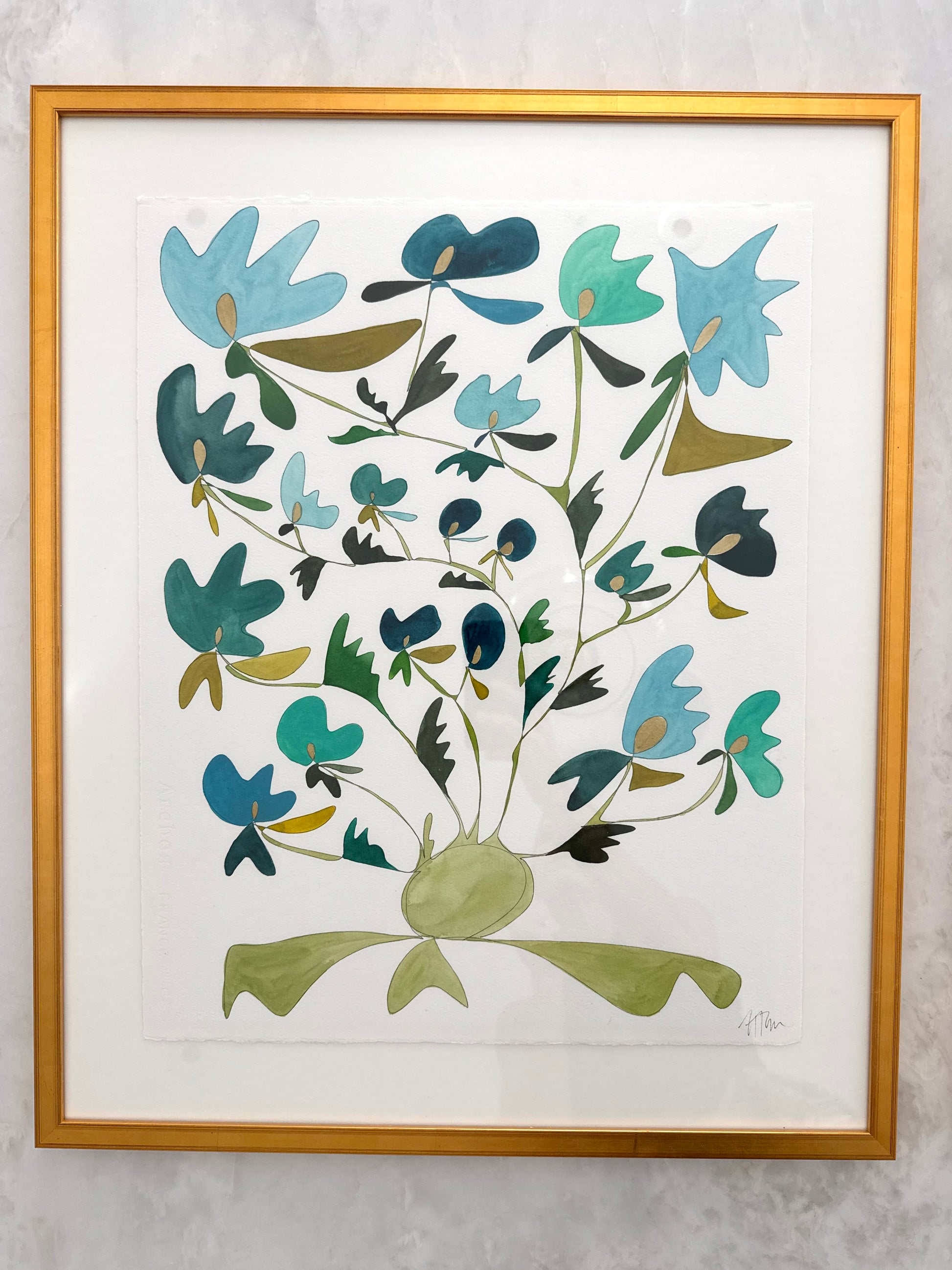 16 x 20 inch original watercolor Rooted on Arches handcrafted watercolor paper with a deckle edge inside custom gold frame with a mat (total size of frame is 21 x 25.5 inches).