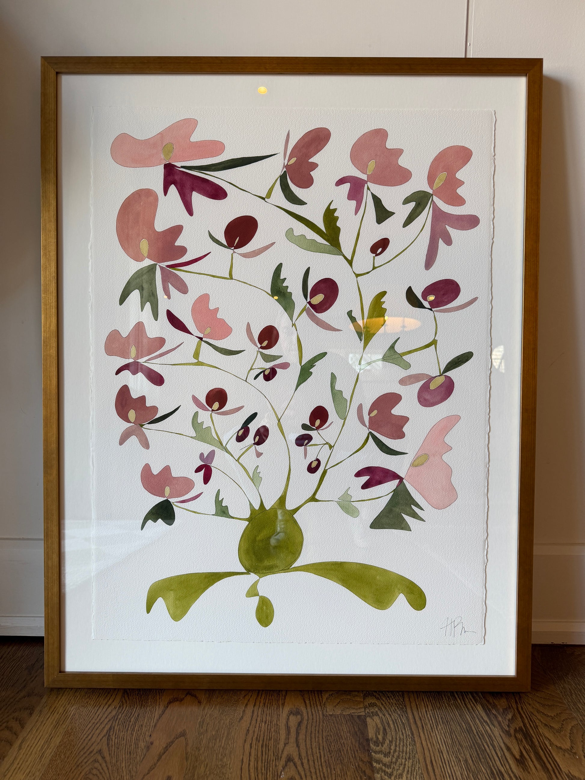This original Rooted 22 × 30 inch watercolor on Arches hand crafted watercolor paper with a deckle edge is floating on top of a creamy white mat inside a custom deep gold 27.75 x 35.5 inch frame.