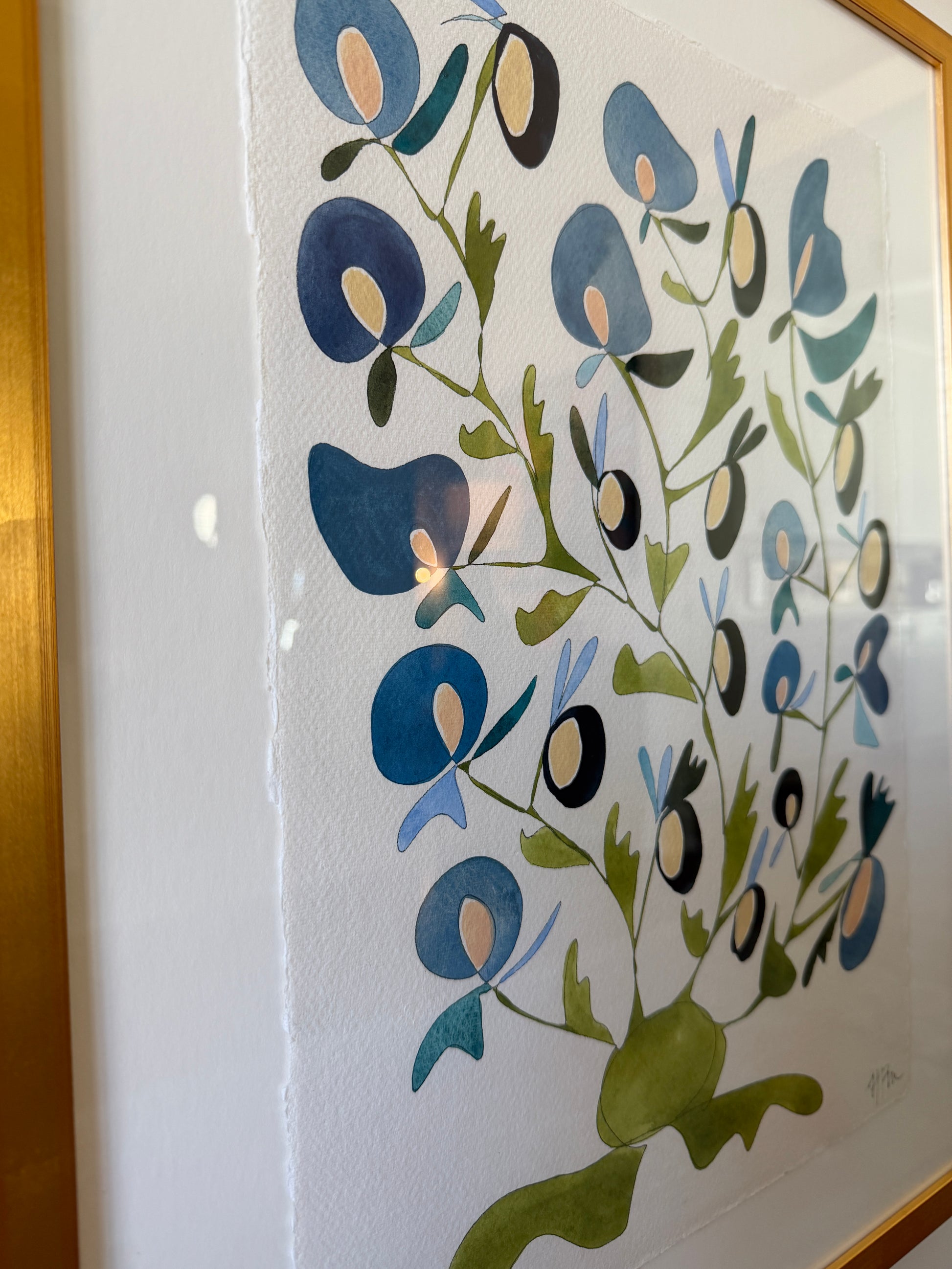 12×16.25 inch original watercolor Rooted on handmade cotton watercolor paper floating on a creamy mat inside a custom gold frame.