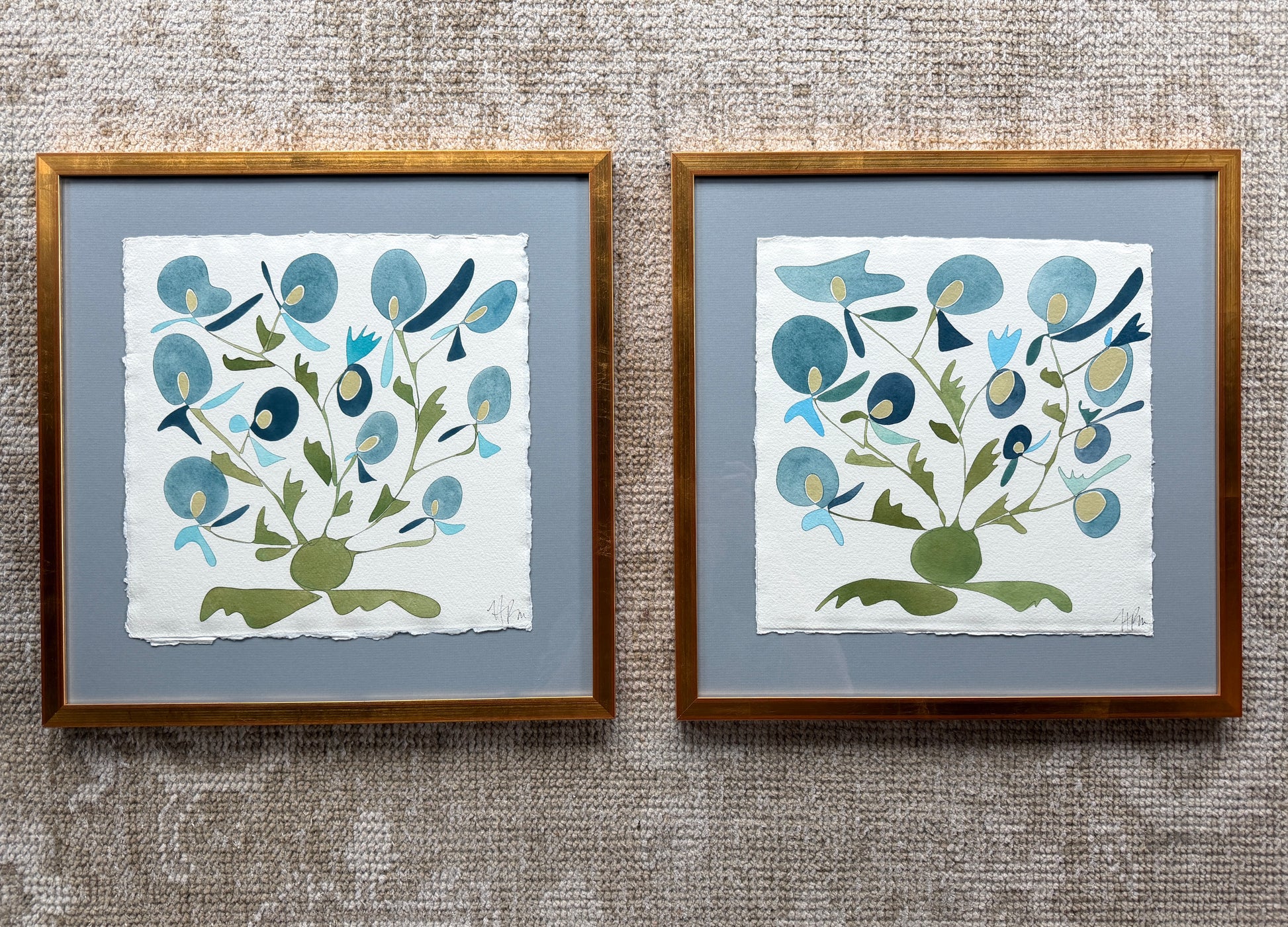 12×12 inch original watercolor Rooted on handmade cotton watercolor paper floating on a mat inside a custom gold frame.