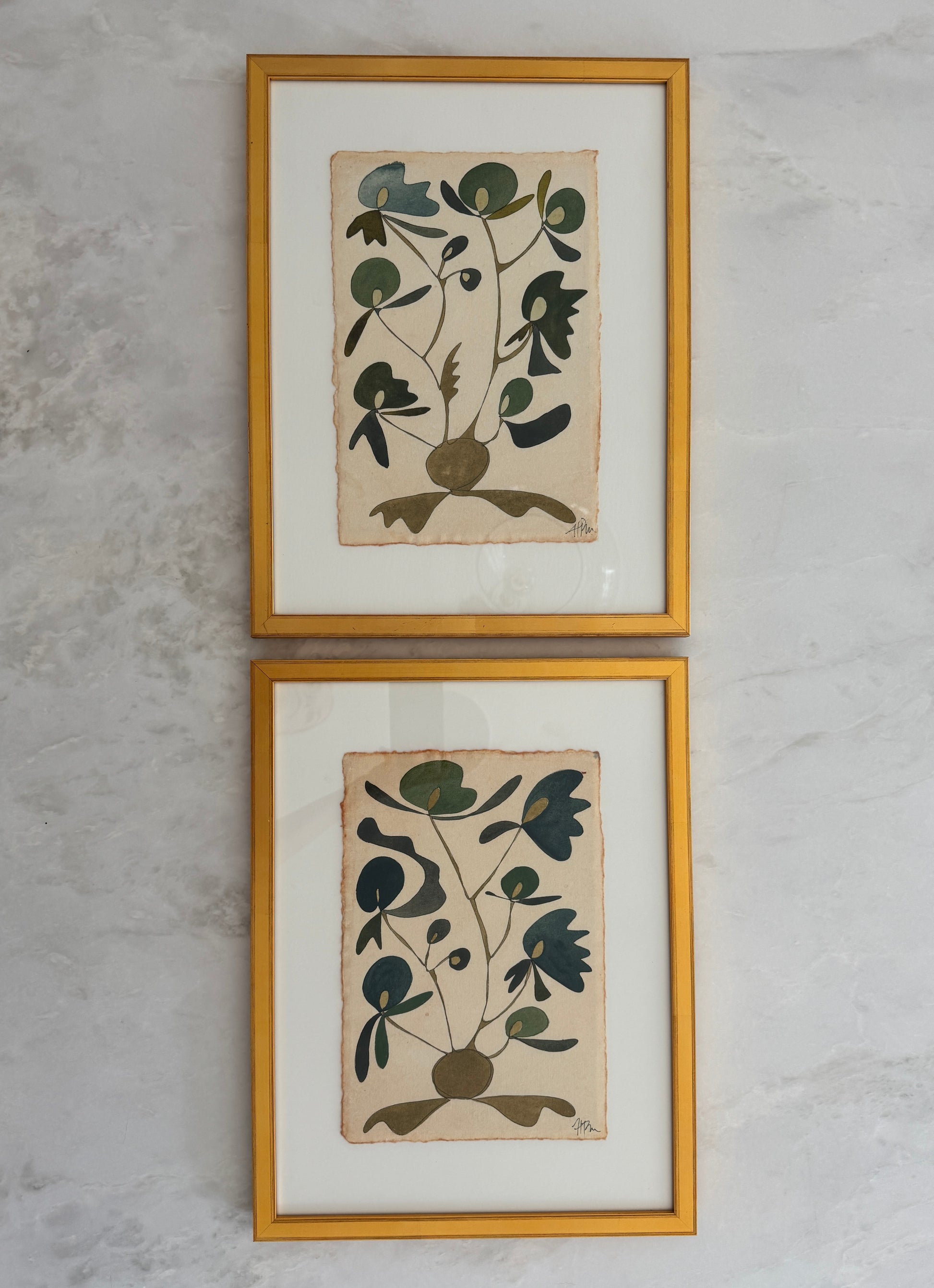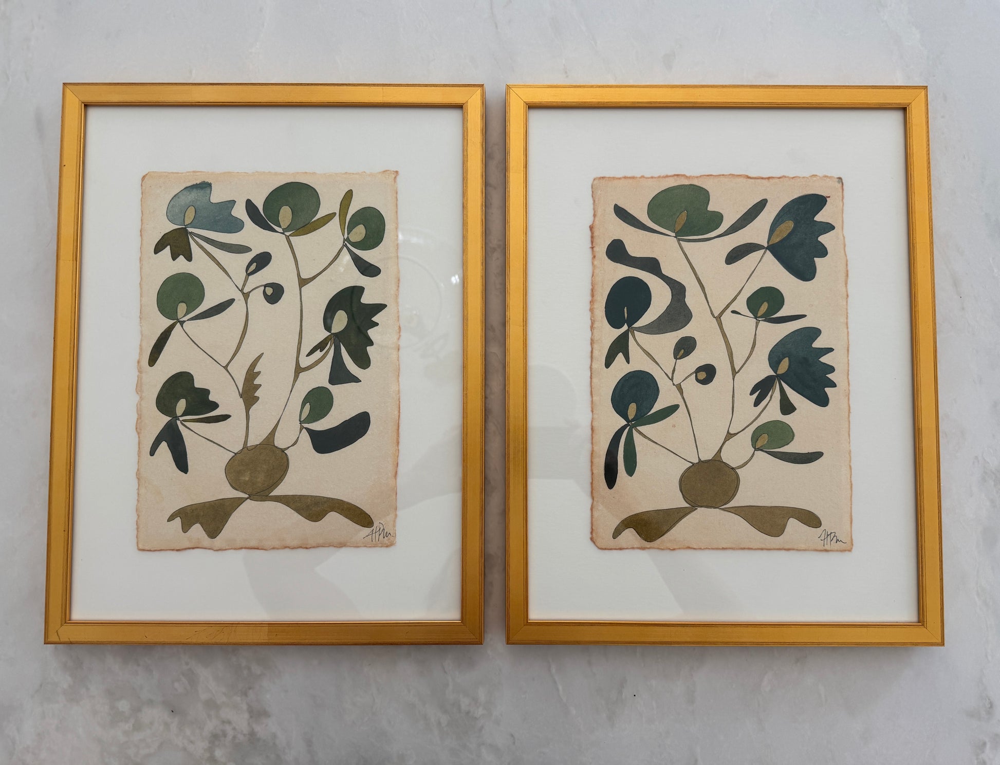 Pair of 8.25 x 11.75 inch original watercolor Rooted paintings on handcrafted antiqued watercolor paper with a deckle edge inside custom gold frame with creamy mat (total size of each frame is 12.75 x 16.75 inches).