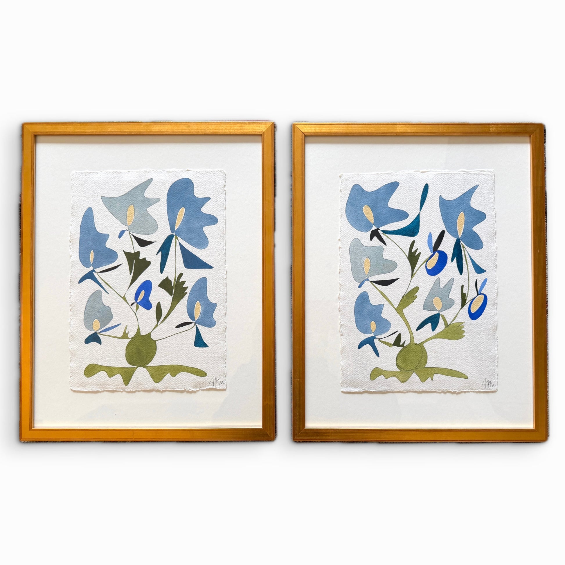 Pair of 8.25 x 11.75 inch watercolor Rooted on a creamy recycled handmade cotton rag watercolor paper with a deckle edge floating on a creamy mat inside a custom gold frame.