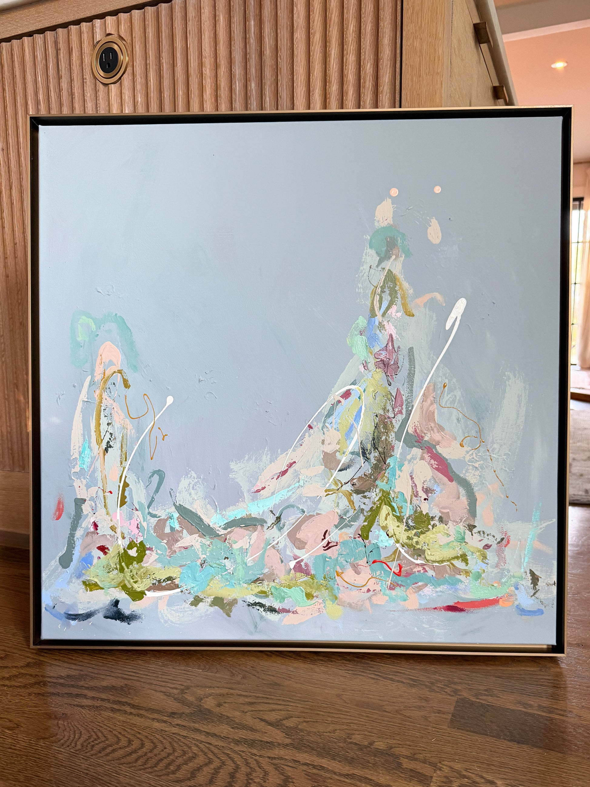 24 x 24 inch wrapped canvas inside a low profile rustic gold frame.