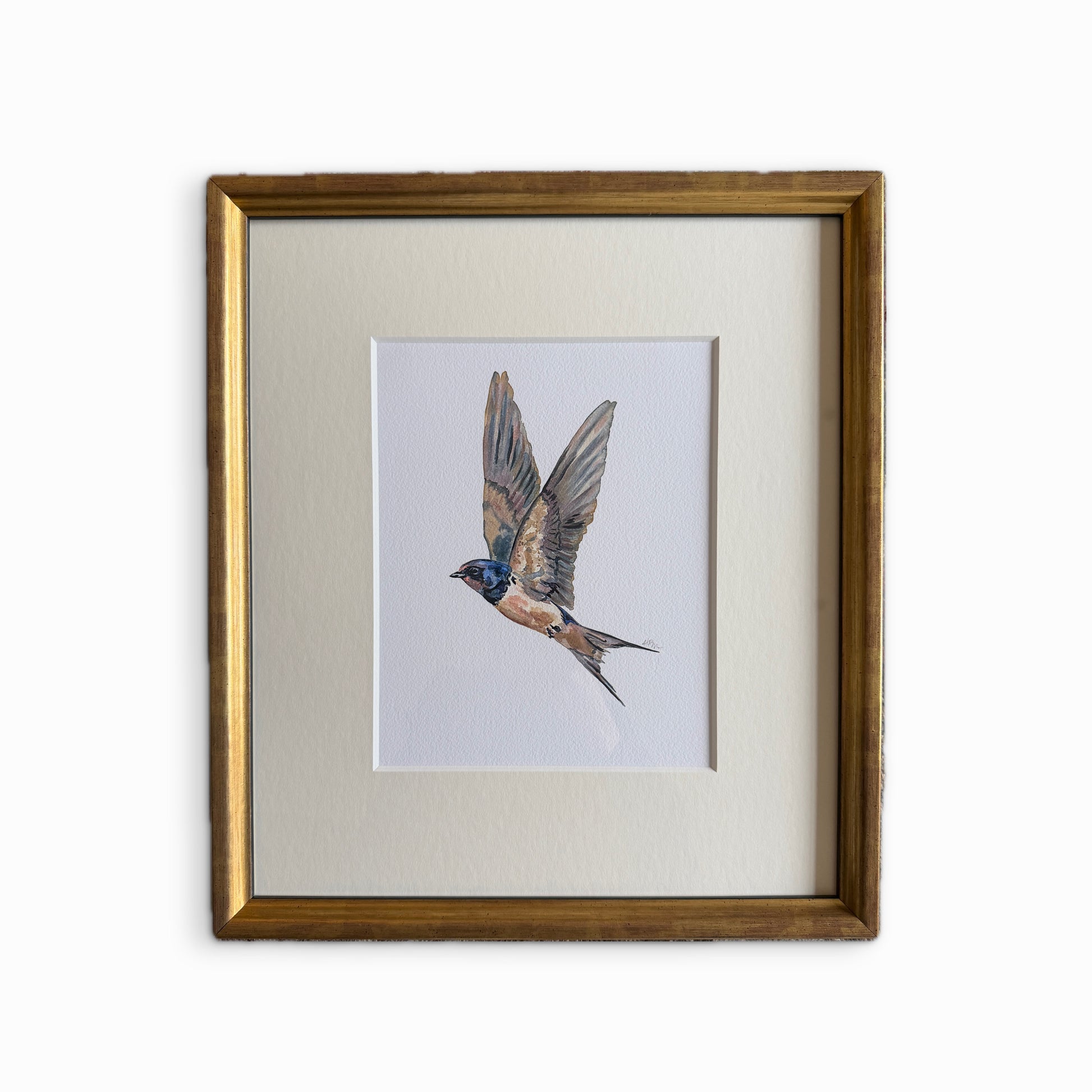 8x10 premium watercolor bird print, set deep inside a thick cream mat with a custom gold with black edged frame.